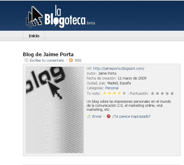 Hace unos días registré este blog en laBlogoteca, un espacio habilitado por 20minutos para promover el desarrollo de los blogs y exponer un espacio donde dar a conocer tu blog al mundo.