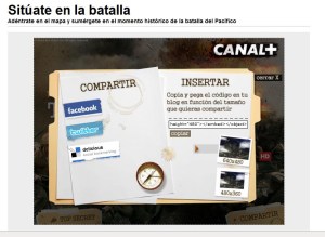 En esta ocasión, se trata de la nueva serie de Canal +: The Pacific. Tiene buena pinta, no lo dudo… pero lo que me interesa es que van teniendo muy en cuenta la forma que tiene la gente de comunicarse a través de las redes sociales, por lo que la acción puede ser enviada directamente a tu Facebook, Twitter y Delicious; así como copiar el video para ponerlo, por ejemplo, en este blog.