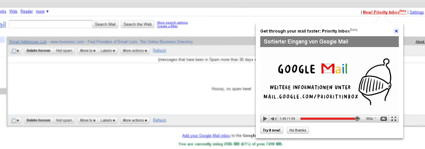 Acabo de descubrir en mi cuenta de Gmail un nuevo lanzamiento de Google: el Priority Inbox, mediante el cual Google parece que va a decidir qué correos son importantes para nosotros y qué no.