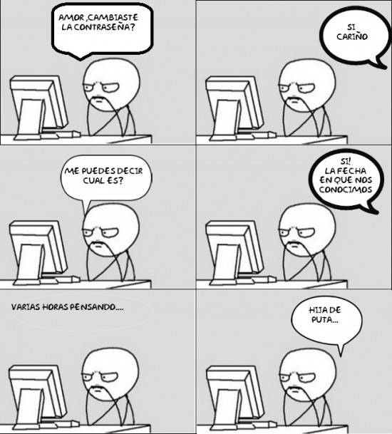 “nombre del perro + nº de hijos + la quinta letra de la web que visitas + la fecha de tu aniversario (que así, de paso, la recuerdas y no te metes en líos)”